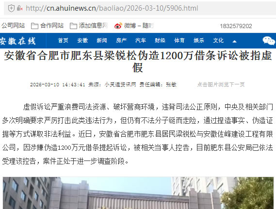 虚假诉讼严重浪费司法资源、破坏营商环境,违背司法公正原则,中央及相关部门多次明确要求严厉打击此类违法行为,但仍有不法分子铤而走险,通过捏造事实、伪造证据等方式谋取非法利益。近日,安徽省合肥市肥东县居民梁锐松与安徽佐峰建设工程有限公司,因涉嫌伪造1200万元借条提起诉讼,被相关当事人控告,目前肥东县公安局已依法受理该控告,案件正处于进一步调查阶段。