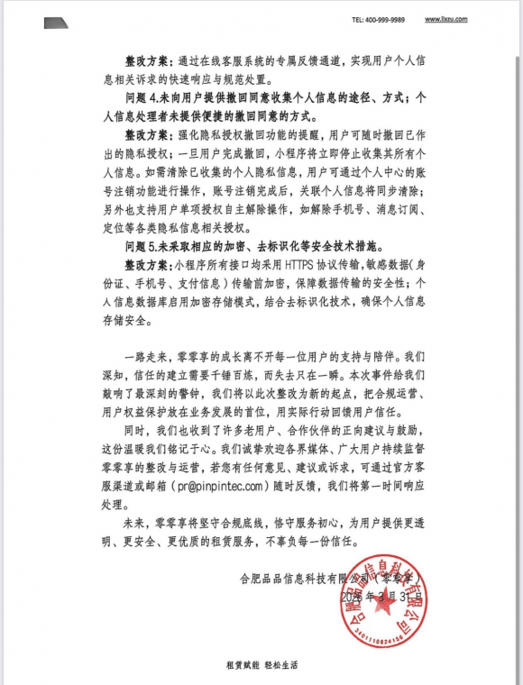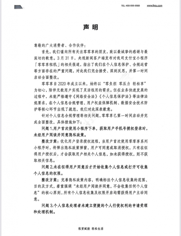 3月31日,国内头部消费租赁平台零零享发布了一则官方声明,就近期个人信息合规问题作出详细说明。这份声明没有回避问题,而是逐条对照、逐项整改,并以“完全接受、深刻反思”的态度坦诚面对。